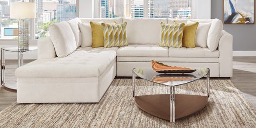 Relax in your living room with the contemporary style of the Sheridan Square sectional from Cindy Crawford Home. This stunning sectional is upholstered in cozy off white chenille fabric that helps you relax without sacrificing on durability. The beautiful appearance of this sectional is highlighted by tufting on the seat cushions and loose back cushions that add a casualness to the piece. The perfect finishing touch to this sectional is a pop-up trundle sleeper that conveniently tucks away under the piece when not in use by overnight guests. This room comes complete with a cocktail table, end table and table lamp. Upholstery: 100% Polyester. Cleaning Instructions: Use water based cleaning agents or foam. Small accent pillows not included. Lamp not as shown in room image.