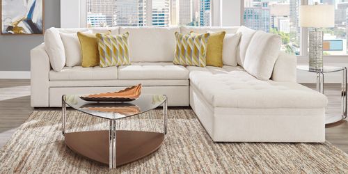 Relax in your living room with the contemporary style of the Sheridan Square sectional from Cindy Crawford Home. This stunning sectional is upholstered in cozy off white chenille fabric that helps you relax without sacrificing on durability. The beautiful appearance of this sectional is highlighted by tufting on the seat cushions and loose back cushions that add a casualness to the piece. The perfect finishing touch to this sectional is a pop-up trundle sleeper that conveniently tucks away under the piece when not in use by overnight guests. This room comes complete with a cocktail table, end table and table lamp. Upholstery: 100% Polyester. Cleaning Instructions: Use water based cleaning agents or foam. Small accent pillows not included. Lamp not as shown in room image.