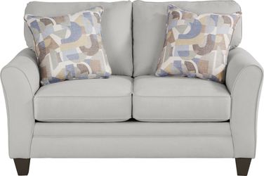 The soothing hues of the ocean meet the warmth of the sandy shore in the Coralville living room, a relaxing collection of soft curves, tranquil lines, and comfy cushions. This casual room features brushed twill fabric in a gray hue with subtle roll arms and welted seams throughout. Blue mosaic accent pillows add a gentle touch of style while tapered square legs in a warm brown finish perfectly rounds off the ensemble. Upholstery: 100% Polyester. Cleaning Instructions: Use water based cleaning agents or foam.