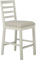 Enjoy meals together with the farmhouse-style Everdeen Cottage counter height dining collection. Crafted of wood solids and birch veneers, the table boasts a charming two-tone white and brown cherry finish. With four drop leaves, the 60-inch round tabletop effortlessly transforms into a perfect square. The table's white pedestal base includes convenient storage cubbies and room for display, while a revolving tray in the center adds ease and fun to family dining. Coordinating stools in a white finish feature comfortable upholstered seats and a traditional ladder back design.