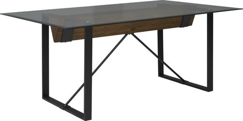 Anchor your dining area with the Everton dining set. Offering modern character thanks to its clean lines and industrial metal accents, this set also features a roomy 42 x 72 table top with 1" bevel and evokes contemporary appeal in any space. Minimalist inspired, brown hued chairs featuring gently curved edges complete the ensemble.