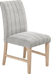 You've got a reservation for the hottest dining experience in town, and the Kendall collection is serving it family-style. A 59" round table anchors this trendy dining room, featuring a contemporary tabletop and flared pedestal base in a natural finish. Matching side chairs with tapered wood legs showcase channeling details stitched into gray upholstery for a crisp, tailored look.