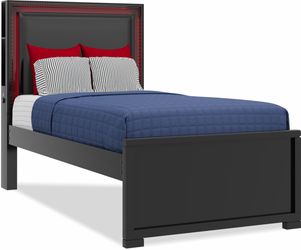With an industrial-inspired look that levels up your loved one's space, the Carbon Optix twin bedroom delivers the ultimate style for game time. Crafted in a high gloss, black lacquered finish, the bed features a headboard upholstered with contemporary performance fabric that has the texture of carbon fiber. An epic array of integrated multicolor remote-controlled LED lights glow and beam to stunning effect. The left side of the headboard features touch sensor power for the lights and dual USB-A ports for charging electronic devices. Side storage panels on the headboard provide the perfect space for stashing away headphones and controllers. The dresser features six drawers constructed with durable English dovetail joints and dust proof bottoms. Each drawer has easy to clean upholstery that coordinates with the headboard. Custom pewter drawer pulls have a diamond pattern texture with a look and feel inspired by the levers of a motorbike. A mirror completes the room. Mattress and foundation (if required) sold separately. Reversible underbed storage drawers sold separately.