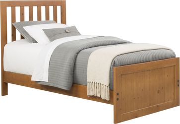 Underbed storage trundle not included. Add a bit of rustic charm to your child's bedroom with the Creekside slat bedroom. Each piece is made of pine solids in a taffy finish with knotty pine characteristics that add beautiful eye appeal. The bed's open slat headboard and paneled footboard make it an appealing choice. A dresser with matching wood drawer pulls and a mirror with a corkboard complete the room. Mattress and bunkie board included. To purchase the room as pictured add the trundle option above. Mattress and bunkie board included.