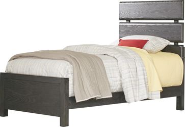 The versatile rustic style of the Midcity Loft bedroom means that its timeless design easily transitions from childhood to teenage years. Each piece is made of wood solids and hickory veneers, with a charcoal carbon finish that features weathering and distressing details. Accented with antiqued pewter hardware, each piece is reinforced with French and English dovetail drawer construction. Dust-proofing along the bottom keeps their clothes tidy and free of dust and other debris. Each slat in the bed's headboard is slightly rounded for safety. Mattress and foundation (if required) sold separately. Bed shown is full size.