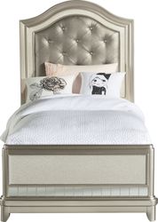 Underbed storage trundle not included. Lounge in luxury with the fashionably chic Petit Paris bedroom. Finely crafted of pine solids and birch veneers in a stunning champagne finish, each elegant piece is embellished with mirrored accents and artful molding details. The statement-making headboard features a padded inset covered with beautifully tufted embossed fabric in a coordinating color. Chic turned legs are the perfect finishing touch. Mattress and foundation (if required) sold separately.