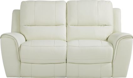 Offering a winning combination of comfort and quality, the Lanzo collection boasts luxurious top grain leather upholstery where the body touches in a chic off-white color. Padded backs and plush attached seat cushions make each piece sumptuously cozy, creating an ideal setting for family and friends to hang out and relax. The reclining sofa features recliners on each side that gives you structured comfort from head to toe. The loveseat is stationary, making it the perfect seat for one or two. Each headrest is ultra-plush, providing optimum neck and head support as you read, watch TV, or relax. Shaped roll arms are highlighted with coordinating stitching details for a clean, contemporary look. This incredible room package includes a new 2020 65 in. LG Smart UHD TV. The TV included in the Ultimate TV package is available for free doorway delivery by Best Buy or pickup at Best Buy locations. Substitution of comparable TV if necessary. Upholstery: Top grain leather where the body touches and vinyl sides and backs. Leather is a durable, low maintenance product, however, general regular maintenance is necessary. To keep your leather clean, vacuum it regularly, removing any dust, and clean it with water and a mild non-detergent soap. Accent pillows not included. Lamp not as shown in room image.