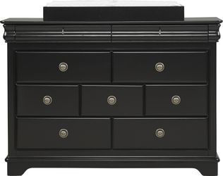 Lay your little one in luxury with the sturdy and stylish Oberon nursery. Subtle sloping curves and clean slats create a lovely look with a classic design. Comprised of wood solids and finished in a non-toxic black finish, it's oversized to help accommodate growth spurts. A four-point positioning system goes up to 6.5," creating an easily adjustable mattress height. This crib is JPMA certified and it meets or exceeds all safety standards set by the CPSC and ASTM. Exceptionally versatile, the changing tray and pad can easily be removed as your baby grows, transitioning into young adulthood and beyond. The inclusion of toddler and conversion rails help this crib become an adaptable bed for your child as they grow. Customer assembly required. Crib mattress and linens not included.