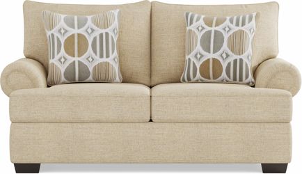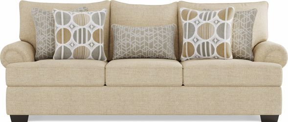 Bright neutral tones trace soft shapes and angles to highlight the Reyna Point living room's elegant, easygoing charm. This contemporary collection's tan colored woven fabric offers a substantial and comforting feel. The subtle wedge-shaped back and reversible back cushion on each seat ensures the ideal angle and support for maximum comfort, inviting guests to relax into the deep seats. Adjusting positions is easy with convenient roll arms to either side, and welted seams on each cushion provide subtle visual poise throughout the room. Upholstery: 100% Polyester. Cleaning Instructions: Use water-based cleaning agents or foam.