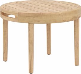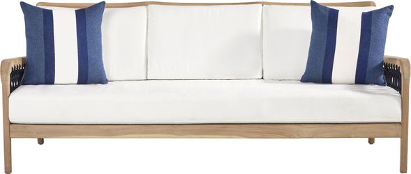 The good life is on deck with the chic and playful style of the Riva patio seating set. This stunning collection features frames crafted of solid teak in a blonde finish, each gently sloped arm threaded with a gorgeous lattice of marine-grade rope in colorfast navy blue secured with a nautical knot. Reversible white seat and back cushions offer plush comfort in durable, UV-resistant outdoor fabric. A pair of teak nesting tables with slatted tops complete the look.