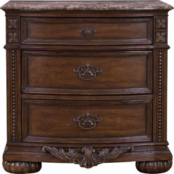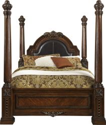 The Worthington collection brings home traditional elegance. Superbly crafted in wood solids and cherry veneers with a rich brown cherry finish, the dramatic poster bed features a leather-style inset bordered by decorative nailhead accents. It features oversized pilasters and gold tipping finish on delicate carved effects. Coordinating pieces - including a beautiful marble top dresser - are similarly detailed in this impressive group. All merchandise is available, but not shown in every showroom. Call Online Support Staff at 1(888) 709-5380 for details. Mattress set sold separately in our href="index.cfm?fuseaction=beddingHome">Bedding Section.